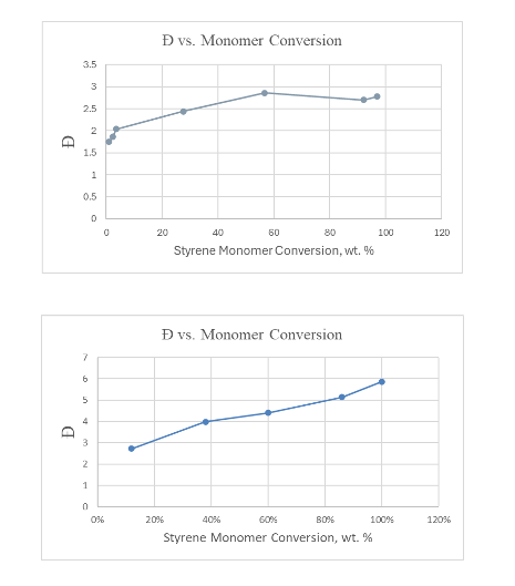 The first plot below shows how the dispersity proceeds with time (expressed as conversion of monomer to polymer) for a typical polystyrene batch emulsion polymerization at 70 °C when a common level of CTA (t-dodecyl mercaptan in this case) is used. You will note that compared to the results when no CTA is used (the second, or lower plot), there is a remarkable narrowing of the MW distribution. This, as explained above, is due to the lowering of the MW produced during the first two-time intervals of the EP reaction, lessening the impact of the lower MW chains produced during the third time period.